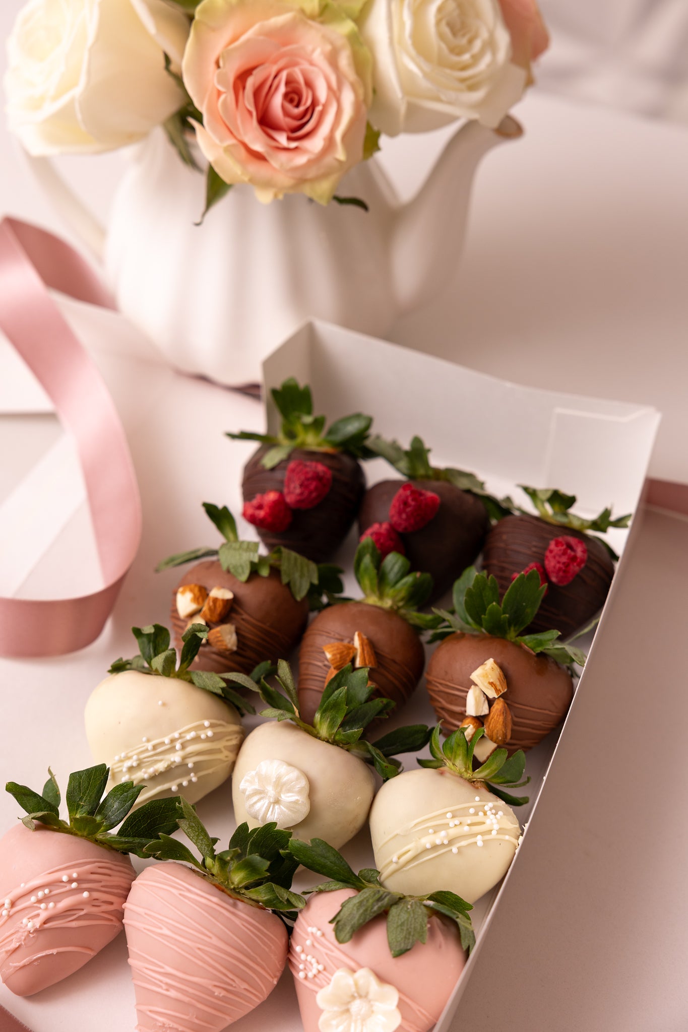Chocolate & Amor — Strawberry Dozen features twelve fresh strawberries dipped and finished by hand, offering a harmonious mix of chocolate profiles and textures.